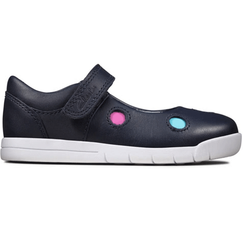These adorable bar shoes from Clarks are crafted from a soft leather upper detailed with fun coloured dots. Being a versatile shoe which offers a casual look; this lightweight design is easy to slip on and has a velcro fastening strap to create a secure and snug fit. Benefitting from a durable sole with flex grooves for maximum flexibility, these shoes have a padded top line and a lightly cushioned insole making them super comfortable.