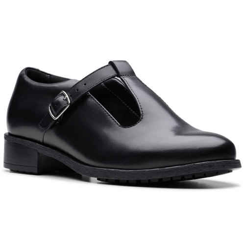 This traditional style from Clarks is crafted from a supple leather upper with a durable rubber sole offering excellent grip. This T-Bar design has a buckle fastening to allow an adjustable and secure fit whilst the small practical heel offers a wearable height boost. The cushioned insole provides ultimate underfoot cushioning making them perfect for all day long wear. Great for school, work or any smart occasion paired with trousers or a skirt. Approx. heel height: 3.5cm.