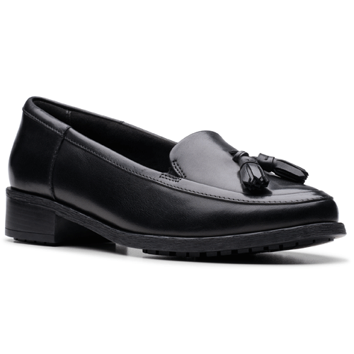 This loafer style from Clarks is crafted from a supple leather upper with a tassel embellishment on the front for an eye-catching look. A durable rubber sole offers excellent grip whilst the small practical heel offers a wearable height boost. The ‘Contour Comfort’ insole provides ultimate underfoot cushioning making them perfect for all day wear. Great for school, work or any smart occasion paired with trousers or a skirt. Approx. heel height: 3.5cm.